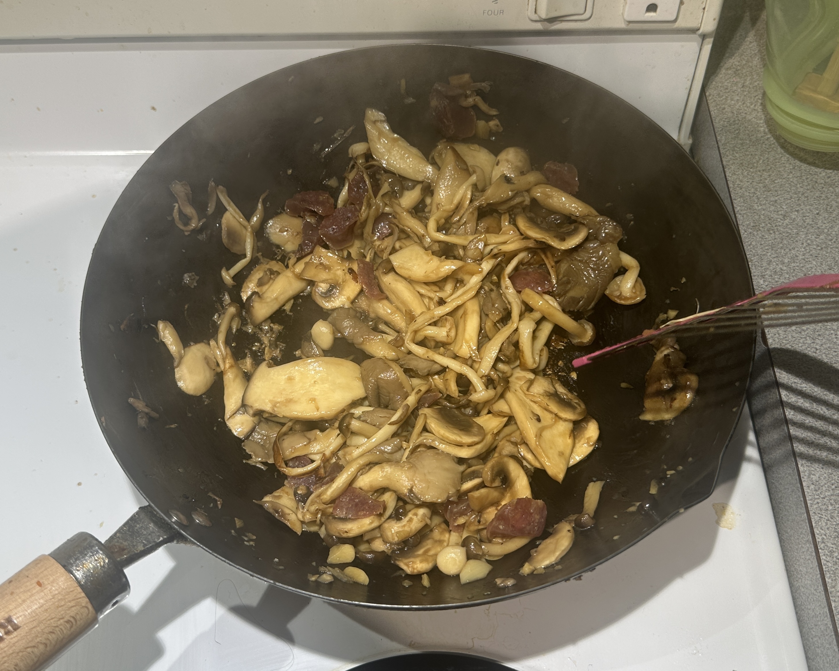 炒炒炒! 把调料香味炒出来、裹进蘑菇里。 差不多干香时即可出锅。